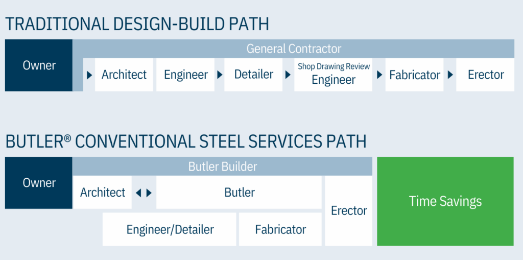 A conventional solution encompasses all conventional steel products, ranging from wide-flange beams and bar joists, Butler B-Deck, to pipes and tubes. The design possibilities are endless, from special features to multi-story facilities.